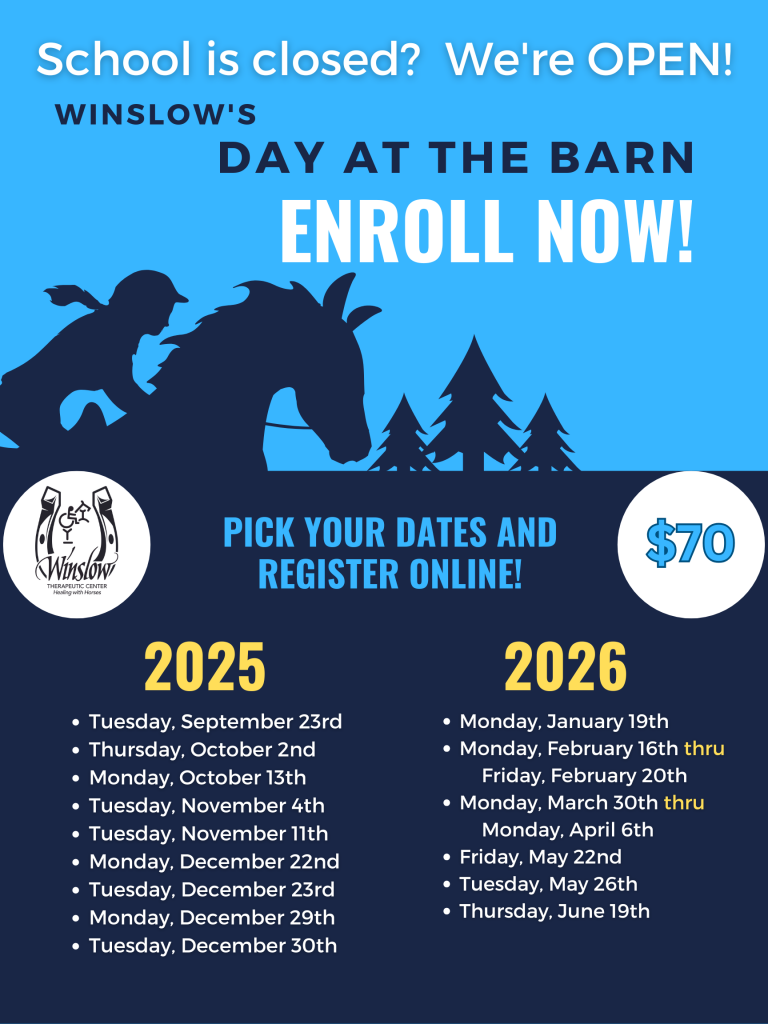 We offer Day at the Barn on 24 dates during the 2025-2026 school year. You can pick one date or as many as you’d like! All dates align with local school holidays so your rider can spend their time off in the unique, encouraging, and empowering environment we have at Winslow Therapeutic Riding Center.